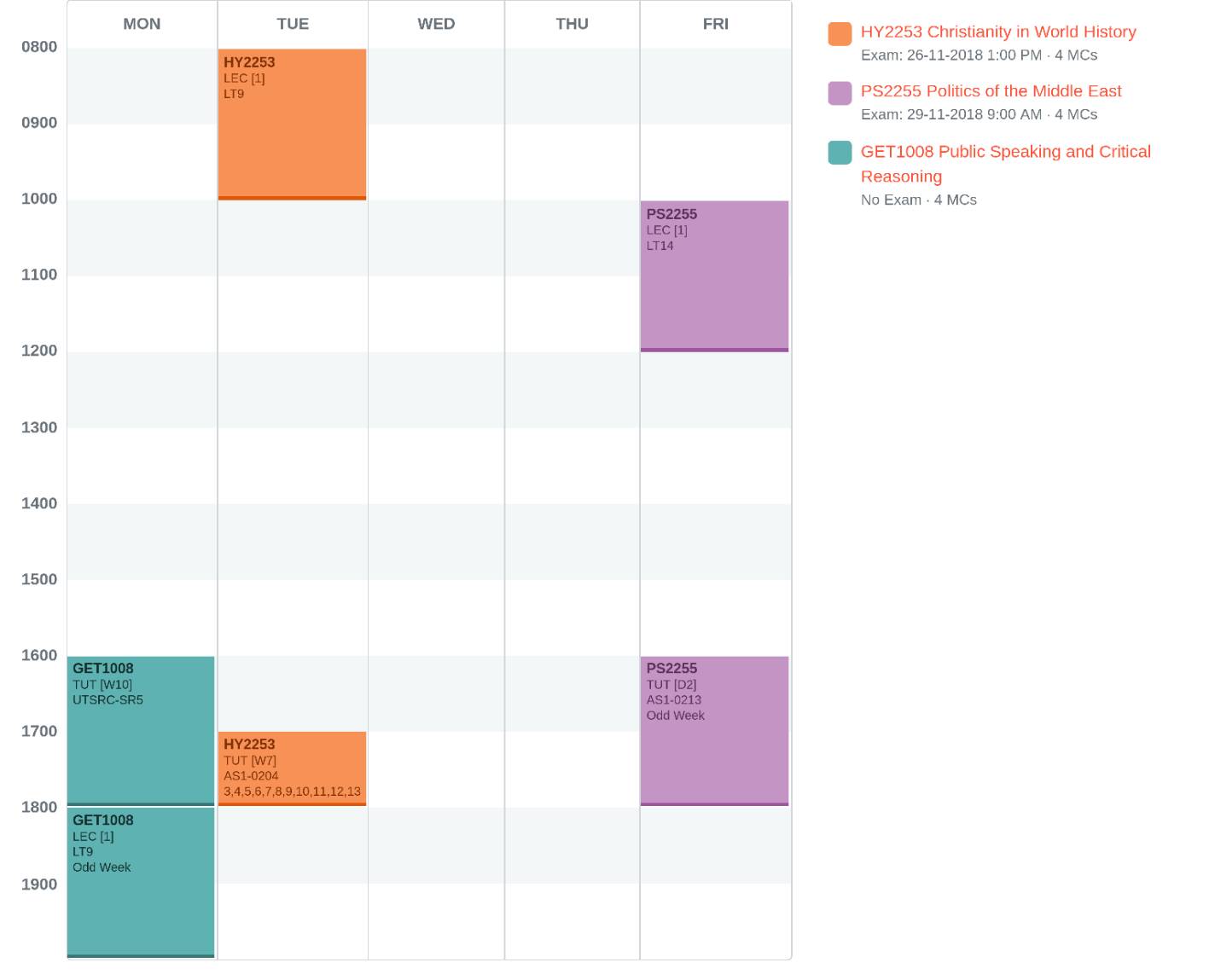 私のNUS前期の時間割を見ればわかると思いますが、lectureとtutorialは必ずしも講義のすぐあとに行われるものではないです。